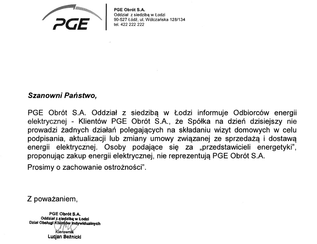 KOLEJNE OSTRZEŻENIE PRZED OSZUSTAMI (informacja od PGE)